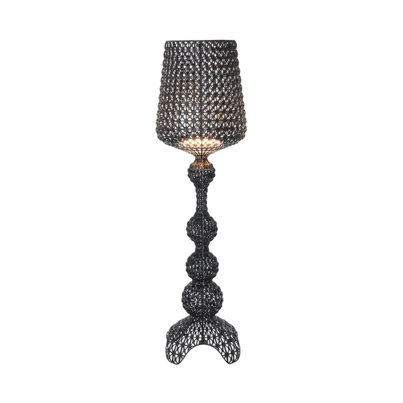 Die Kabuki in Schwarz, wird mit einer neuen Spritzgießtechnik aus Thermoplaste hergestellt. Mit der Kombination aus der neuen Technik, dem Material und der gewebten Struktur hat Kartell es geschafft eine einzigartige Lampenserie zu erschaffen. Auch das Licht der Lampen ist durch die Struktur charakteristisch für die Kabuki Serie.