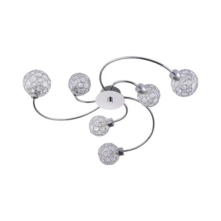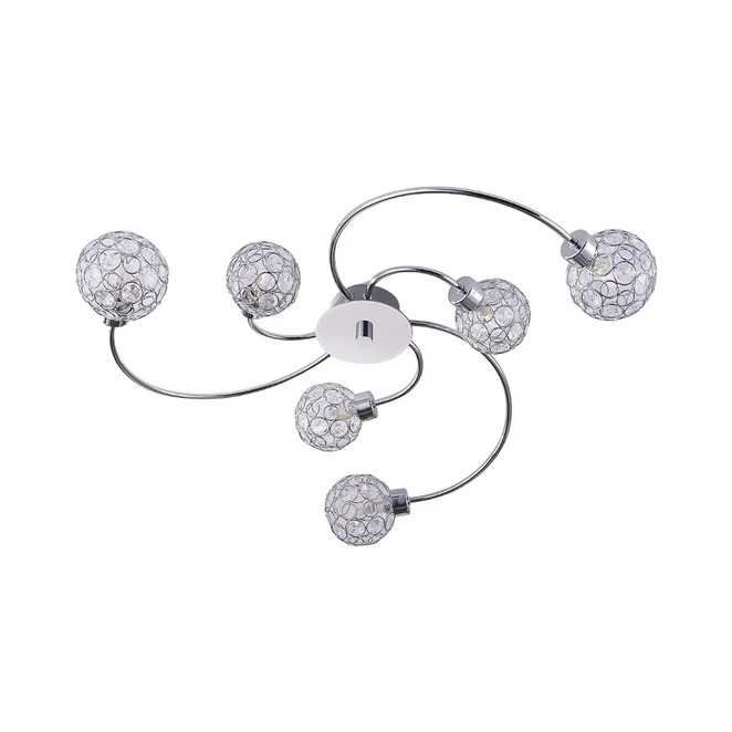 Tyron Deckenleuchte Chrom/Klar ist der Inbegriff einer eleganten Leuchte. Das kunstvoll gedrehte Stativ in Kombination mit den glitzernden Kugellampenschirmen und der harmonischen Verbindung von Metall und Glas strahlt Extravaganz und Exklusivität aus. Die sechs Schirme sind paarweise angeordnet und bilden ein schönes Dreiblatt um die Mitte der Leuchte. Die Halterung und das Stativ sind verchromt und verleihen der Leuchte ein modernes Aussehen. Die Schirme selbst haben eine regelmäßige Struktur aus Metall, die mit Glasperlen durchsetzt ist, die einen schönen Edelstein-Effekt erzeugen. Dieser Effekt wird verstärkt, wenn die Leuchte eingeschaltet ist, und erzeugt faszinierende Lichtmuster an der Decke. Das Glas ist transparent, so dass die Lichtquellen direkt in ein klares Licht strahlen, das in den Raum hineinreicht und alle Ecken erhellt.